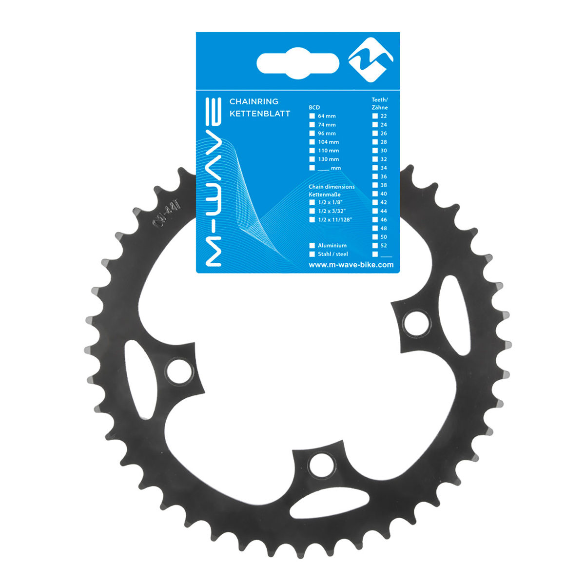Teräksinen keskiöratas E-bikeihin.- 44 hampainen- Ketjujako 1/2″- Ketjuleveys 3/32″, 11/128″ ketjuille- 4-pulttikiinnitys- Väri: Musta- BCD/ ristikkäisten reikien väli 104mm- Paino: 204gRattaiden reikävälin mittaaminen4-pulttisessa mallissa ruuvien välien mittaaminen: mittaa ruuvien väli vierekkäisten reikien välillä 5-pulttisessa mallissa ruuvien välin mittaaminen: pääsääntöisesti käytä oheista mittataulukkoa avuksi. Pulttien määrä rattaassa Pituus kahden eri reiän välillä Reikien ristikkäinen väli mm. tuumat (PCD/BCD) 4 45.3mm. 1.78 inch 64mm 4 56.6mm 2.23 inch 80mm 4 62.2mm 2.45 inch 88mm 4 66.5mm 2.62 inch 94mm 4 67.9mm 2.67 inch 96mm 4 72.1mm 2.84 inch 102mm 4 73.5mm 2.90 inch 104mm 4 84.9mm 3.34 inch 120mm 5 43.5mm 1.71 inch 74mm 5 55.2mm 2.18 inch 94mm 5 64.7mm 2.55 inch 110mm 5 76.4mm 3.01 inch 130mm 5 9.4 mm 3.12 inch 135mm Laskukaavio ulkokehällä olevien pulttivälien laskemista varten: 4-pulttinen: Vierekkäisten reikien väli jaettuna luvulla 0.7071 = pulttiväli 5-pulttinen: Vierekkäisten reikien väli jaettuna luvulla 0.5878 = pulttiväli