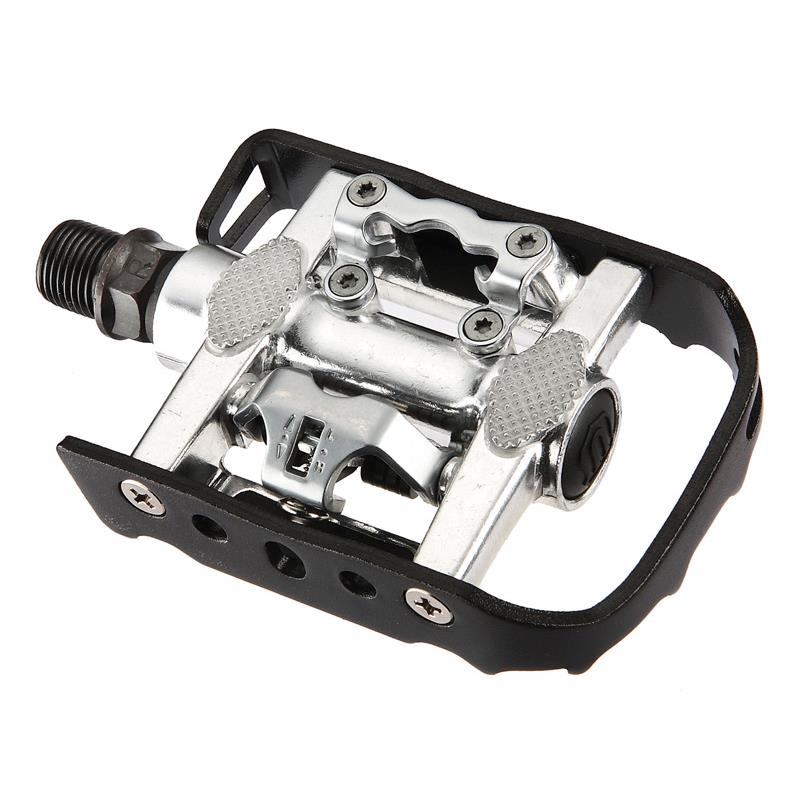 Yhdistelmäpoljin: toiselta puolelta SPD-kenkään yhteensopiva jatoiselta puolelta normikenkään sopiva malli.- Malli: SP-5850- Kierre 9/16″- Materiaali: Alumiini- Akselimateriaali: CrMo-teräs- Koko: 102x65mm- Paino: 372g/pari- Shimano SPD- yhteensopiva- Väri: Hopea/musta