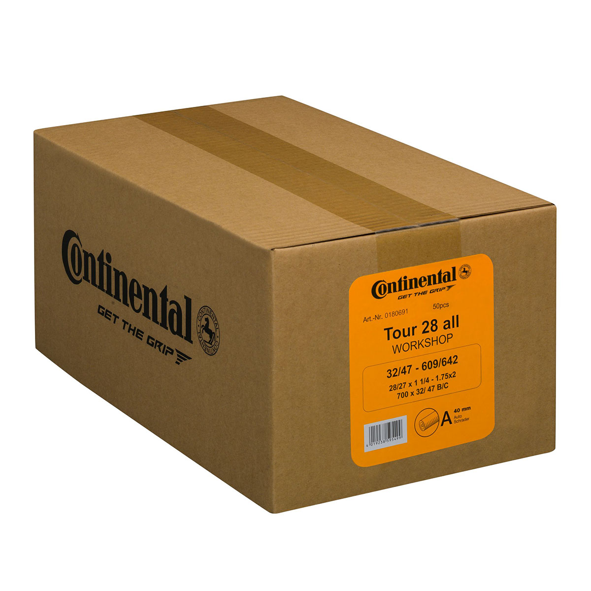 Continental polkupyörän sisärengasKorjaamokäyttöön tarkoitettu BULK-malliilman myyntipakkauksia. Laatikkokoko 50 kpl.- Malli: Tour 28 All Service (perusmalli)- Koko: 32/47-622/642 – Venttiilityyppi: Autonventtiili 40 mm.- Paino: 165g.- Laatikkokoko: 50 kpl.Sisärengas vaikuttaa myös renkaan ajo-ominaisuuksiin.Joka koossa saatavilla olevassa perusmallissa yhdistyvät parhaalla tavalla arkipäivän vaatimuksiin soveltuvat ominaisuudet. Light- ja Supersonic-sisärenkaat taas mahdollistavat korkeammat nopeudet kisakäytössä keveytänsä ansiosta. Kevyemmät sisärenkaat ovat materiaaliltaan ohuempia, joten niiden kanssa on erityisen tärkeää huolehtia oikeista ilmanpaineista rengasrikkojen välttämiseksi.