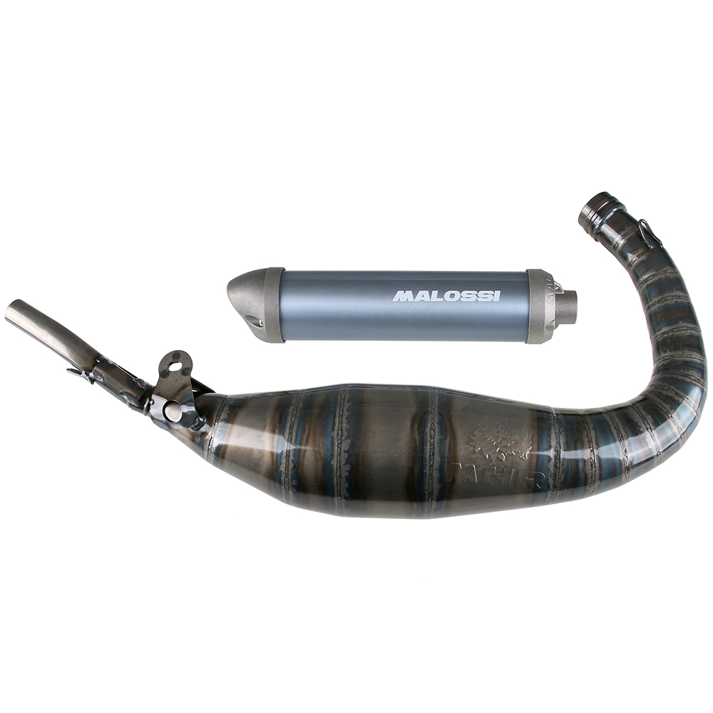 Kaikki Malossi Racing pakoputket on valmistettu tarkalleen 0,8mm teräksisistä levyistä, laserleikkauksella ja koottu erittäin tarkasti Robotti- T.I.G. ja M.I.G. -hitsauksella yhdistettynä käsinhitsaukseen oksiasetyyleenitekniikan kanssa. Lopuksi jokainen putki käydään vielä käsityönä vasaralla läpi optimaalisen viimeistelyn saavuttamiseksi. Suutinputki on kalibroitu tiukkojen toleranssien mukaan varmistaen, että paine pakoputkessa pysyy oikeissa rajoissa. Pakoputket on päällystetty kirkastetulla pinnalla ja sen mukana tulee mustaksi anodisoitu alumiininen vaimennin varustettuna Malossi logolla.