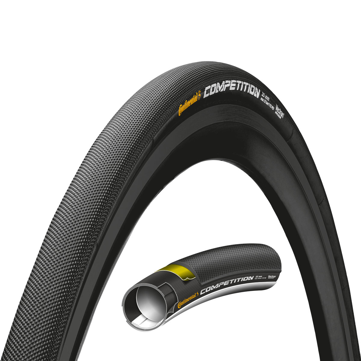 Ominaisuudet:- Käsintehty Saksassa.- Koko: 28″x25mm- Paino: 280g.- Kulumisilmaisin.- Suosituspaine: 115 psi/7,9 bar- Maksimipaine: 170 psi/11,7 bar- Kudostiheys: 3/180 tpi.+Vectran™Suurmestari.Competition merkitsee aitoa käsityötä neulaa ja lankaa käyttäen. Se on ammattilaispelotonin luotettavin rengas. Se on kerta toisensa jälkeen todistanut kykynsä maailmannäyttämöllä, usein auttaen nimekkäitä pyöräilijöitä matkaamaan voittoon, kuten Cadel Evans vuoden 2011 Ranskan ympäriajossa.Olemme ylpeitä Competitionistamme ja siksi pidämmekin sen aina tiellä kohti voittoa. Competition on mallistomme ensimmäinen rengas, jossa hyödynnettiin BlackChili Compound ja Vectran™ Breaker.Black ChiliContinentalin kehittämä huippukumiseos, joka tavalliseen kumiseokseen verrattuna:- Vähentää vierintävastusta 26%- Lisää pitoa 30%- Parantaa kulutuskestävyyttä 5%!Vectran™Vectran™ on Continentalin kehittämä ja patentoima pistosuojaus, joka:- On kevyempi ja joustavampi sekä suojaa tehokkaammin kuin vastaava nylonpistosuojaus.- Ei heikennä renkaan vierimisvastusta.- On synteettisesti valmistettu, luonnolliseen malliin perustuva huipputekninen kuitu.- On nestekidepolymeeri (LCP), kuten hämähäkin seitti.- Kehrätään sulatetusta Vectra-nestepolymeerista ja jalostetaan edelleen monisäikeiseksi langaksi.Hämähäkin seitin tavoin, Vectran™ vastustaa erittäin hyvin repeytymistä, ollen samalla kevyt. Juuri nämä ominaisuudet tekevät siitä erinomaisen materiaalin käytettäväksi huippuluokan pistosuojiin Continentalin renkaissa.